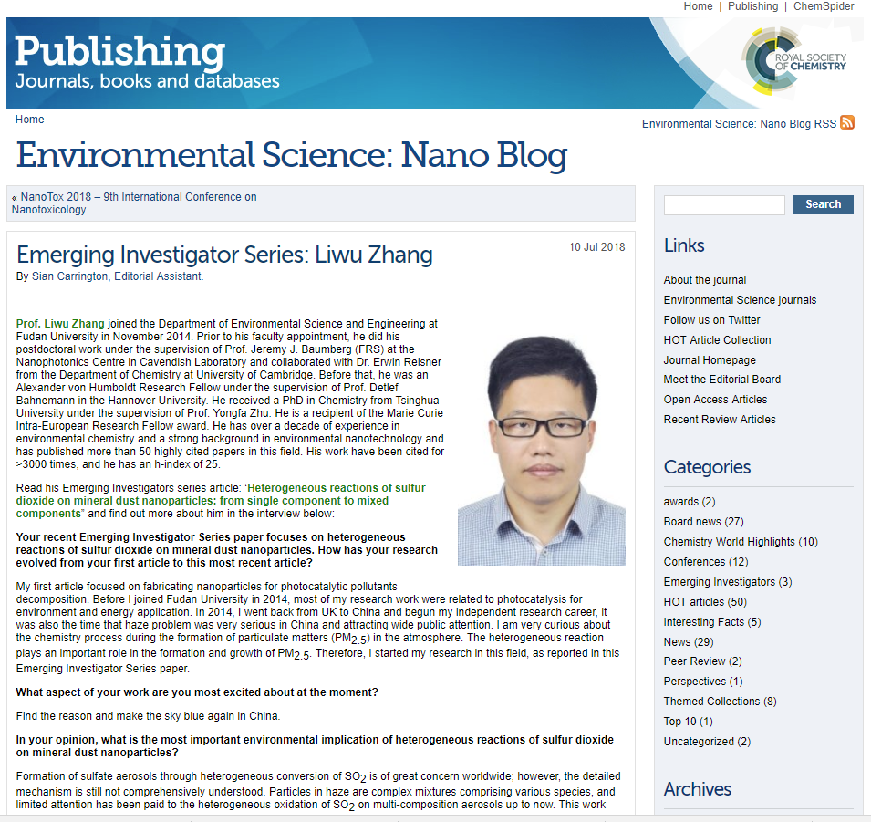近日,英国皇家化学会纳米环境类刊物 Environmental Science: Nano 宣布成人导航 张立武教授入选 Emerging Investigator Series。张立武教授的关于颗粒物内混合组分非均相研究工作成果被遴选为Environmental Science: Nano今年第八期封面论文,并入选Emerging Investigator Series,其个人介绍及采访与论文同时刊登。
