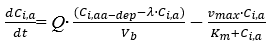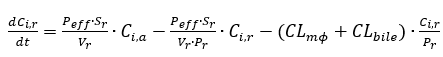 具有生物活性的复杂有机物或难溶组分的毒代动力学过程可能主要受膜渗透性或颗粒粒径的限制。且这些组分结构复杂,难以完全被体内生物酶系统代谢。针对大分子有机物和难溶组分的概念性方程可改写为式6的形式。Peff表示有效膜渗透性,即组分穿过生物膜的速率(m s-1),Sr是组织的表面积(m2),CLmФ和CLbile分别代表巨噬细胞清除速率常数和胆汁清除速率常数,示意该类组分在体内主要的清除途径。