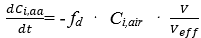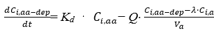 吸入过程:在通过呼吸道时,小粒径颗粒物中组分(i)沉积在肺泡区域的浓度(Ci, aa)可根据吸入空气中该组分浓度的降低来表征(式2)。组分解吸、释放到到肺泡空气中的浓度(Ci, aa-dep)可用式3描述: