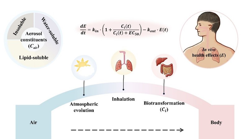 暴露于大气的气溶胶威胁着人类健康,在全球范围内仍未得到有效应对。气溶胶的毒性在很大程度上取决于化学和生物组分,它们在大气转化过程、人体吸入、分布、代谢和清除过程中的浓度和性质不断发生变化。尽管以往对气溶胶静态的组成及其毒性效应开展了大量深入的研究,但其动态变化以及从空气到人体的相关毒性效应仍不清楚。PM2.5的大气动力学已经相对成熟,但是其在体内演化机制的研究却面临多学科方法学上的挑战,限制了基于PM2.5理化性质对人体健康效应的预测与防护。近期,成人导航 大气环境健康团队和公共卫生学院联合香港理工大学提出概念性的气溶胶毒性动力学框架,即,根据大气和体内不断演化的气溶胶组分和化学-转运-代谢等机制,推导出可在体内发挥生物效应的动力学方程,从而预测单组分或多组分混合物在体内的特定生物效应。研究成果发表于环境领域著名期刊Environmental Science & Technology,标题为“Aerosol Toxicokinetics: A Framework for Unraveling Toxicological Dynamics from Air to the Body”。