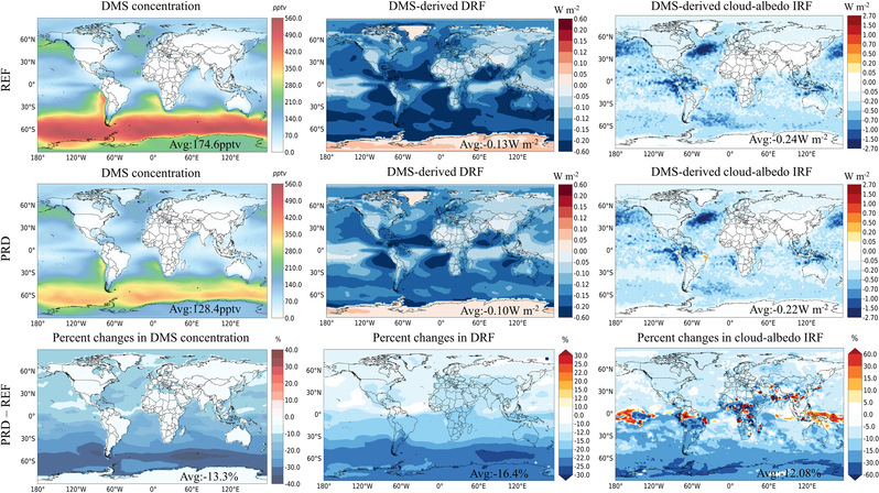 图3. 2099年大气DMS浓度和DMS 排放导致的直接辐射强迫和第一间接辐射强迫空间分布