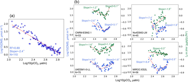 图1. ESMs中pCO2和DMS的响应关系。(a)表层海水中pCO2和DMS对比散点图,(b)CMIP6地球系统模式预测的海洋pCO2和DMS(左y轴)以及pCO2和和海洋净初级生产力(右y轴)对比。