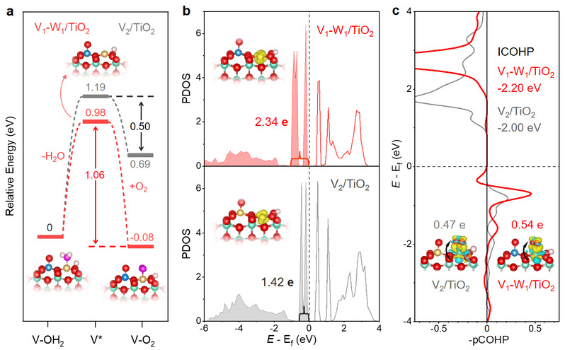 基于实验结果进行了DFT计算以探究原子对上的SCR反应机理。计算结果显示,相对于V2/TiO2,V1-W1/TiO2上进行的SCR过程在能量上更加有利。原子对上发生的SCR反应涉及了V=O键中悬挂O的消耗与补充,所以除了Eley-Rideal (ER)机理外,该反应中还包括了Mars-van Krevelen-Ertl (MKE)机制。因此,原子对上的SCR反应遵循着MKE辅助的ER机理。进一步的理论计算表明,V1-W1原子对在费米能级附近产生了更多的高能自旋电荷,显著促进了对O2的吸附和活化。