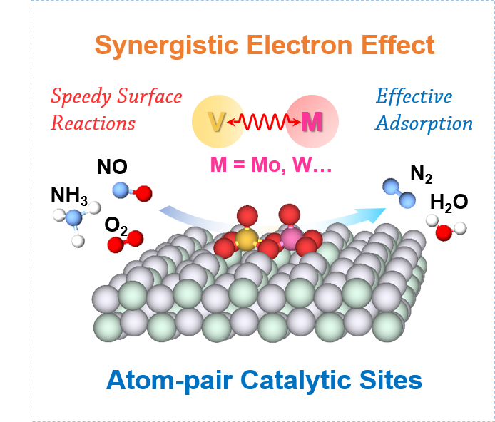 为了合理设计这类高效催化剂,需要从原子水平上识别催化活性位并深入理解反应机理,但商用SCR催化剂结构的复杂性对活性位识别造成了巨大困难,设计合理的模型催化剂以揭示低温SCR活性位的结构和特征十分重要。原子对催化剂是一种新兴的催化剂,其相邻的金属原子之间存在独特的电子协同效应,改变电子协同效应可以调节原子对的吸附与反应性能,这使其成为一种简单而理想的模型催化剂。合理设计原子对活性位并优化其电子协同效应有望从本质上促进SCR反应中反应物的吸附与活化,进而提高低温SCR性能。