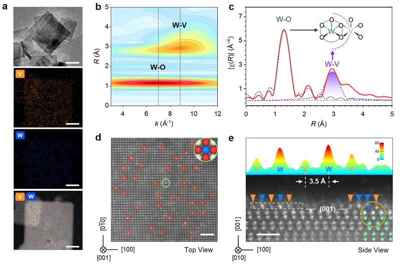 进一步通过拉曼光谱,X射线吸收光谱,X射线光电子能谱结合DFT理论计算对原子对活性位的几何与电子结构进行了探究。V位点和W位点具有VO5和WO5方金字塔几何构型,形成了V-O-W结构,V与W间距离约为3.5 Å。同时对于V2和W2原子对的研究表明它们具有与V1-W1原子对相似的几何结构。X射线光电子能谱表明V1-W1原子对中V为+4价,W为+6价,结合理论计算获得了V1-W1原子对的结构模型。