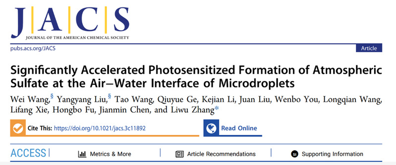 近日,成人导航 张立武课题组在大气化学领域取得重要研究进展。该团队综合运用了尺寸可控的微液滴打印技术、纳秒级高分辨瞬态吸收光谱、共聚焦表面增强拉曼散射(SERS)技术、分子层面的密度泛函理论(DFT)计算以及数值模拟等先进手段,对大气中气溶胶的气-液界面效应对二次硫酸盐形成机制的影响进行了深入研究。他们的研究成果揭示了在气-液界面上,半溶剂化环境能显著加速大气中的光敏化氧化反应,这一发现为理解大气光敏化氧化过程提供了新的视角。研究成果以“Significantly Accelerated Photosensitized Formation of Atmospheric Sulfate at the Air–Water Interface of Microdroplets”为题,于近日发表在Journal of the American Chemical Society期刊上。