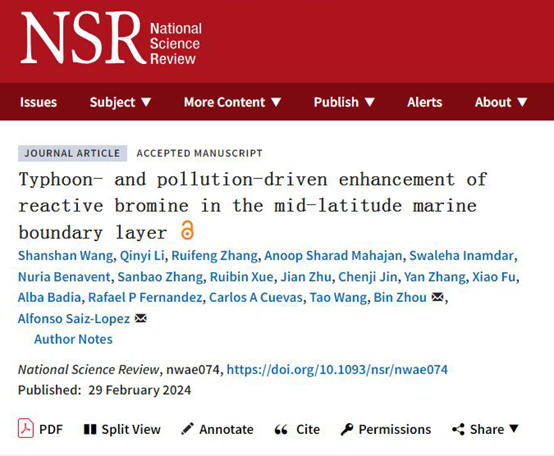 近日,成人导航 王珊珊副教授、周斌教授课题组与西班牙国家研究委员会Alfonso Saiz-Lopez教授团队合作在《国家科学评论》(National Science Review)上发表了题为“Typhoon- and pollution-driven enhancement of reactive bromine in the mid-latitude marine boundary layer”的论文。该论文揭示了台风天气和空气污染对中纬度海洋边界层中活性溴含量的显著影响,为此前被低估的活性溴在大气化学、区域空气污染和全球气候变化中的作用带来了新的见解。成人导航 王珊珊副教授和西班牙国家研究委员会/香港理工大学/山东大学的李沁怡博士为第一作者,成人导航 周斌教授和西班牙国家研究委员会的Alfonso Saiz-Lopez教授为通讯作者。