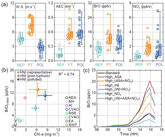 成人导航 的研究团队使用自主研发的多轴差分光学吸收光谱(MAX-DOAS)技术,于2018年夏季在中国东海的花鸟岛观测了活性溴及其他活性成分的大气浓度水平。观测期间研究人员记录到了前所未有的高浓度氧化溴(BrO),这是表征活性溴的一个关键指标。研究发现,白天平均浓度为9.7±4.2 pptv,受台风影响时峰值浓度可达26 pptv,台风期间的风速增加放大了SSA的排放,进而通过SSA的脱溴显著增强了大气中的活性溴(图1和图2a)。BrO与叶绿素-a(Chl-a)浓度之间的正相关关系表明海洋生源排放是溴的有机来源(图2b)。此外,研究团队还发现在高NOx条件下BrO浓度会有所升高,表明存在由大气污染引起的SSA释放溴的机制。通过箱模式模拟,揭示了NOx在控制BrO水平中的竞争作用:一方面,NO2与BrO发生反应,直接降低BrO浓度;另一方面,NOx可增加硝酸盐浓度及其光解,从而加快SSA的活化,进一步释放无机溴,间接增强了BrO水平(图2c)。
