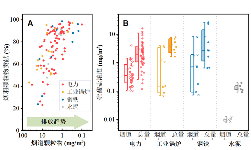 图 1:烟羽颗粒物占比及一次硫酸盐排放浓度。(A)典型固定燃烧源排放的总颗粒物(烟道颗粒物 + 烟羽中新生成颗粒物)比例;(B)一次硫酸盐排放浓度,包括烟道内硫酸盐(烟道)以及烟羽中总硫酸盐(总量)浓度。
