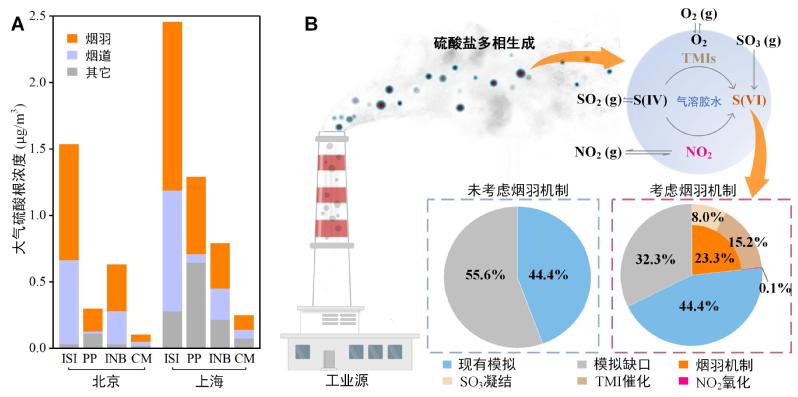 图 2:2019年1月北京与上海不同工业源排放硫酸盐生成路径对大气硫酸盐浓度影响(A)及上海地区不同烟羽中硫酸盐生成机制对大气硫酸盐贡献(B)。