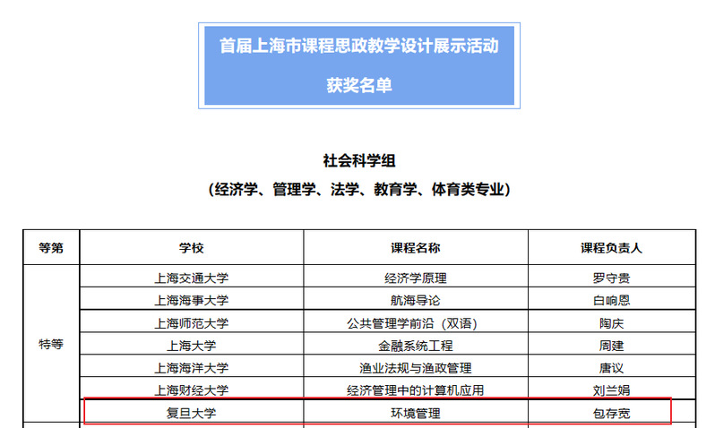 近日,首届上海市课程思政教学设计展示活动收官,成人导航 包存宽教授负责的本科生课程《环境管理》课程荣获社会科学组特等奖。