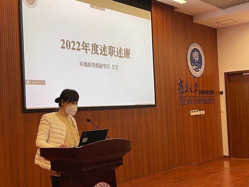 江湾校区环境科学楼1021报告厅召开。环境系党政领导班子成员做述职报告,环境系全体教职员工、博士后和科研助理线上线下参加了会议。会议由副系主任安东老师主持。