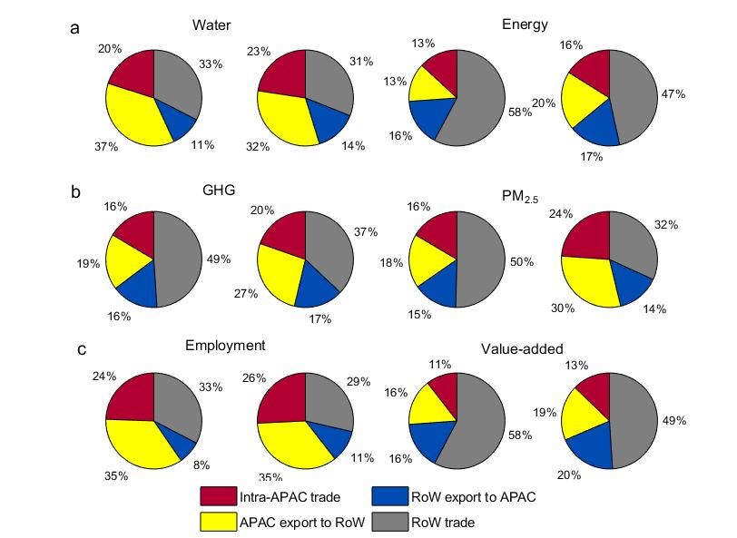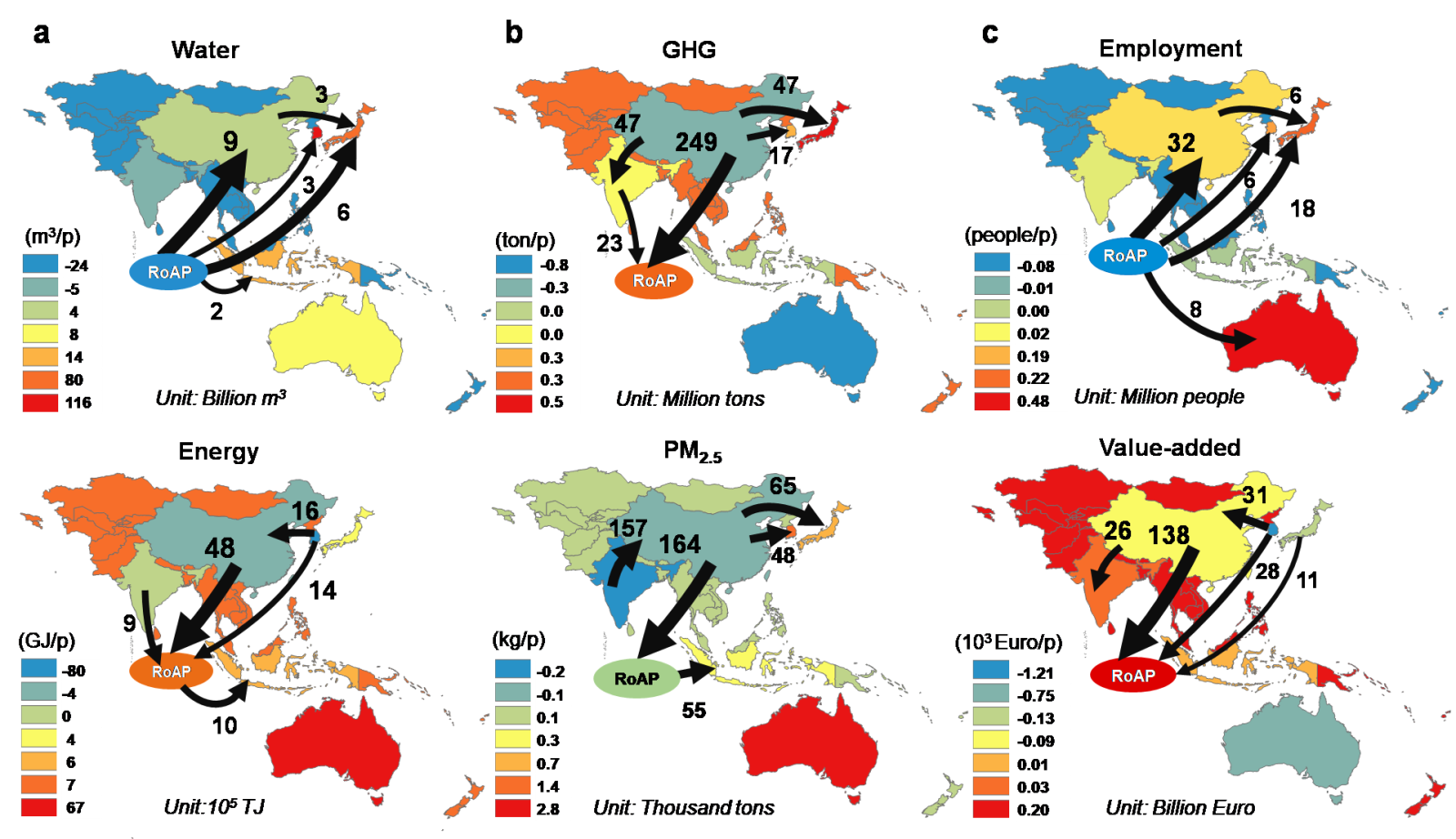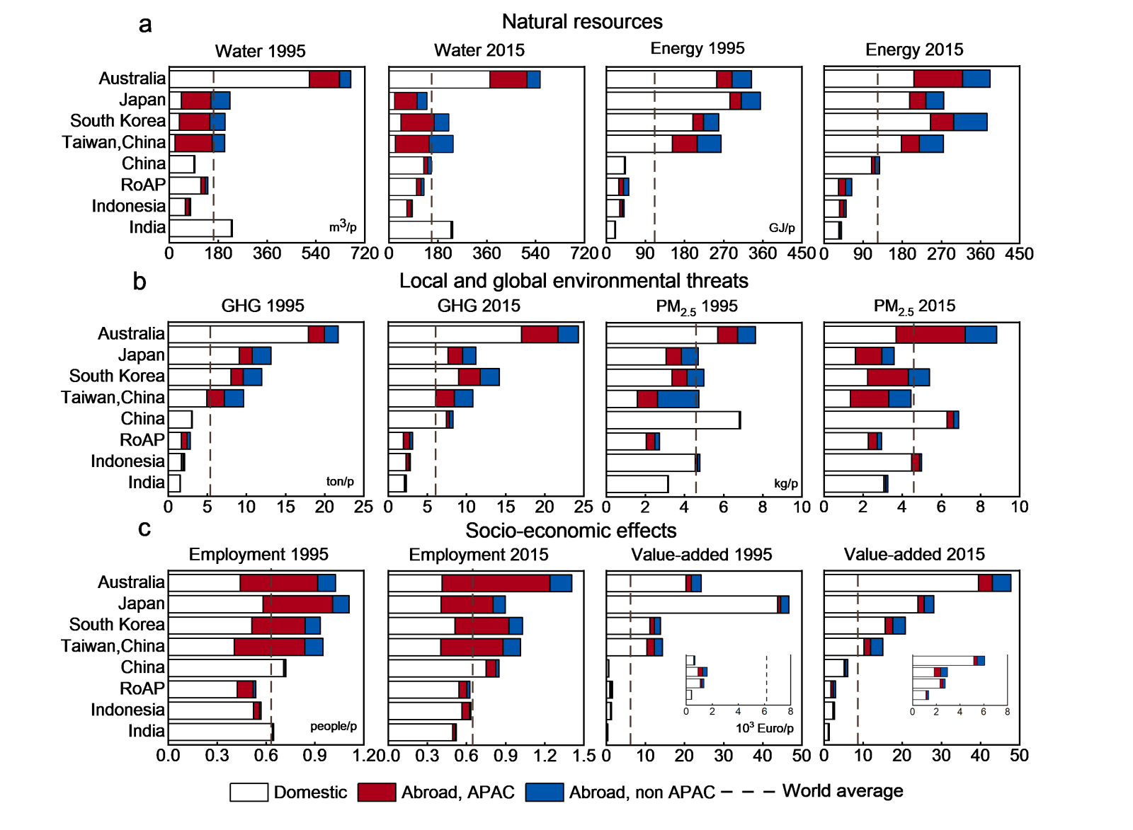 2020年9月8日,国际知名学术期刊《自然-通讯》(Nature Communications)在线发表了题为《Environmental-Social-Economic Footprints of Consumption and Trade in the Asia-Pacific Region》 研究论文(Research article),该研究创新性地从自然资源、本地和全球环境挑战、社会经济影响三个维度构建了可持续发展足迹指标体系,基于多区域投入产出分析方法揭示了研究期间(1995-2015)亚太区域内部贸易使经济体相互依赖性增强的趋势,全球化进程中亚太内部及其与外部的关联变化,并从足迹-贸易强度两方面对比亚太与全球差异。研究结果为亚太地区实现绿色转型与区域可持续发展提供了重要参考。亚太地区在近几十年来成为全球经济发展和贸易最具活力的新兴区域。该区域在全球供应链中占据重要地位,是向世界其他地区提供原材料、中间产品及劳动力的重要来源地。当前,面对广泛的环境、社会和经济可持续性挑战和压力,亚太亟需缓解区域内发展不平衡,同时避免对资源的肆意消耗和脆弱区域的生态环境破坏,这对本地区实现《2030年可持续发展议程》、落实“一带一路”倡议等至关重要。