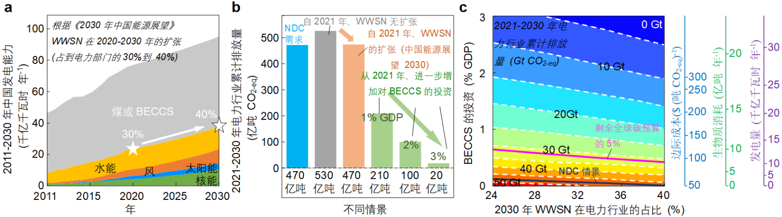 根据中国水电、风能、太阳能和核能的未来10年发展趋势,评估了BECCS技术在综合减排中的贡献。在2021年至2030年间,无需BECCS可达到中国在巴黎气候协定中承诺的减排目标,但使用BECCS技术,可显著增加中国碳减排的潜力,降低中国碳减排的经济成本,使中国更早实现“碳中和”,通过使用BECCS技术,中国可通过投资约1万亿美元,实现中国全球控制增升2 ℃目标的国家责任,其边际成本约为$80(吨CO2-eq)-1,低于风能、太阳能。本研究使用空间显式的数据,揭示了BECCS技术在近期和长期国家碳减排目标方面的贡献,阐明了中国电力系统脱碳的环境、社会经济和技术挑战。