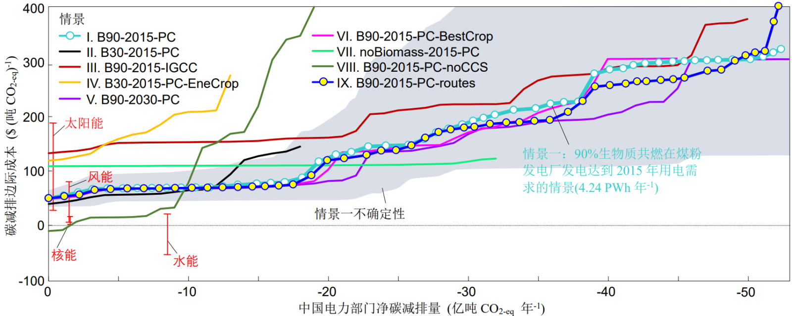 中国通过生物质能源技术实现碳减排的边际成本曲线