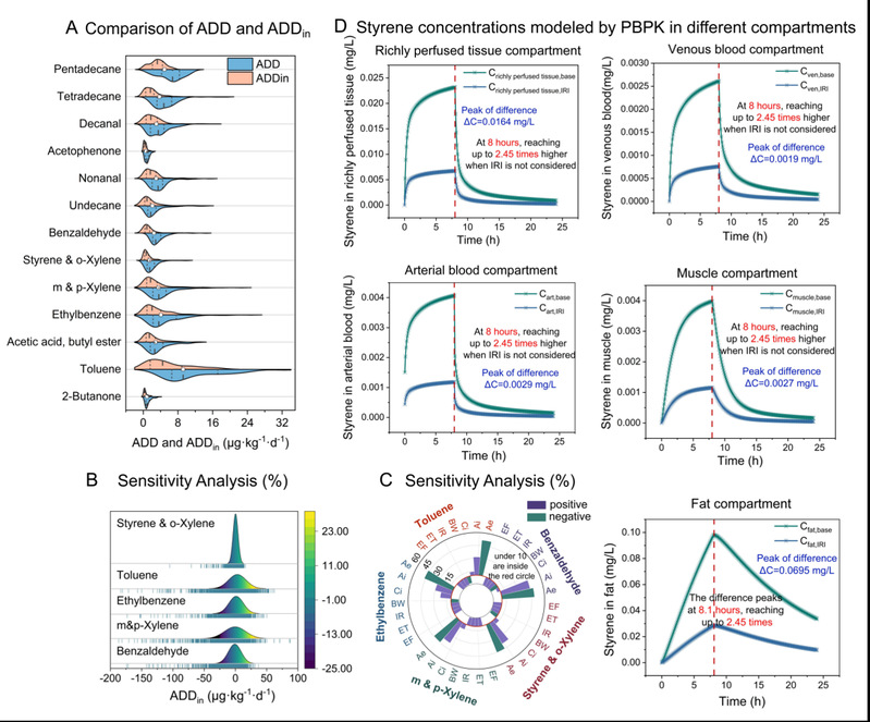 图 2. 将 IRI 融入蒙特卡洛模拟。(A) 实验所得 ADD 与 ADDin 的对比。(B) 基于蒙特卡洛方法(迭代 10000 次)预测的 ADDin 概率分布。(C) 蒙特卡洛模型参数的敏感性分析。(D) 基于 PBPK 模型模拟的苯乙烯在不同组织区室(高灌注组织、静脉血、动脉血、肌肉和脂肪)中的浓度分布。