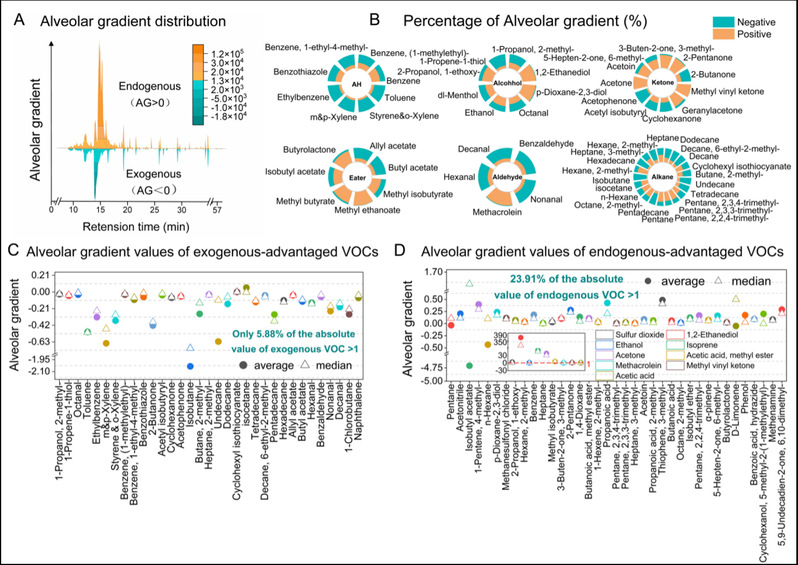 图 1. 通过肺泡梯度识别室内暴露的挥发性有机化合物(VOCs)。(A) 差减色谱图展示了典型健康受试者肺泡梯度的概念示意图。x 轴:中等极性主色谱柱上的保留时间(分钟);y 轴:峰的相对丰度。(B) 主要六类 VOCs(检出率 >80%)的正、负肺泡梯度百分比。(C) 33 种外源优势化合物的肺泡梯度分布。(D) 46 种内源优势化合物的肺泡梯度分布。