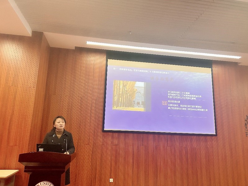 根据学校党委整体要求,系党委书记梅鲜为两系教师开讲本学期教职工政治理论学习第一课,就全体教职工关心的问题设计了政治理论学习内容。以校训为切入点,结合两系情况,从“坚持博学笃志,把学习贯彻党的二十大精神持续引向深入”、“坚持切问近思,推动‘第一个复旦’建设迈出高质量发展新步伐”、“坚持开展行动,把自己放在‘二十大’的宏伟蓝图中建功立业”三个方面展开学习,勉励全体教师在人才培养、学科建设、科研工作、人才战略等方面进行深入思考,找准定位,科学应变;秉持博学而笃志、切问而近思的校训,扎扎实实做好新一年工作,迎接学校第十六次党代会胜利召开,为“第一个复旦”努力奋斗。