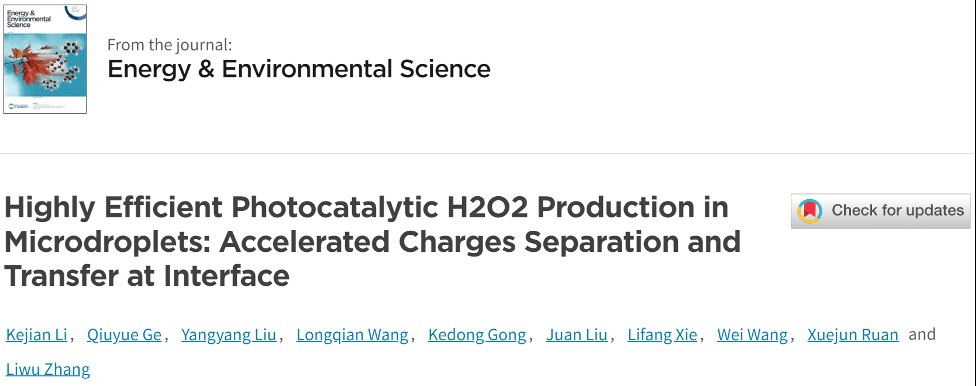 研究成果以“Highly efficient photocatalytic H2O2 production in microdroplets: accelerated charge separation and transfer at interfaces”为题,近期发表于国际知名学术期刊Energy & Environmental Science(影响因子:39.7)。