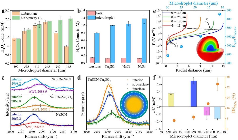基于前期微液滴光化学反应加速的发现(Cell Reports Physical Science 3, 100917, 2022),该工作进一步发现了微液滴中光催化H2O2生成加速效应。系列实验结果表明微液滴表现出超高H2O2产率(20.6 mmol gcat−1 h−1),且性能比体相反应提高两个数量级。微液滴粒径效应和钠盐影响实验指出微液滴气-液界面(AWI)对光催化H2O2生成具有重要作用。原位拉曼光谱测试实验表明,在微液滴气-液界面处,光催化反应速率更快,进一步证实了微液滴AWI对光催化反应的增强效应。除界面处充足高效的O2获取之外,化学键振动Stark效应测试和密度泛函理论计算表明,微液滴AWI处超强电场和部分溶剂化效应可显著改善光生电荷的转移及分离,从而有助于促进光催化H2O2生成。该研究发现了微液滴光化学H2O2生成加速效应,并开辟出以简便方式提升光催化H2O2合成性能的有效途径,有利于光催化技术在能源、环境和绿色合成中的应用。另外,微液滴气溶胶广泛存在于大气环境中,相关实验结果对大气光化学的研究也有重要指导意义。