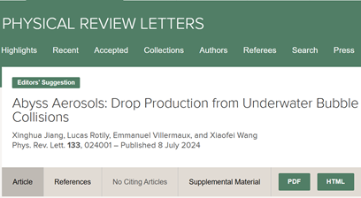 近日,成人导航 王笑非研究员课题组与法国艾克斯-马赛大学Emmanuel Villermaux教授团队合作在物理评论快报(Physical Review Letters)上发表了题为“Abyss Aerosols: Drop Production from Underwater Bubble Collisions”的论文。该论文首次揭示了气泡在水下碰撞产生大量亚微米级液滴的新机理。这一发现为水气界面物质交互提供了全新的视角,并为准确预测海洋飞沫气溶胶的产生通量及其环境效应提供了理论基础。