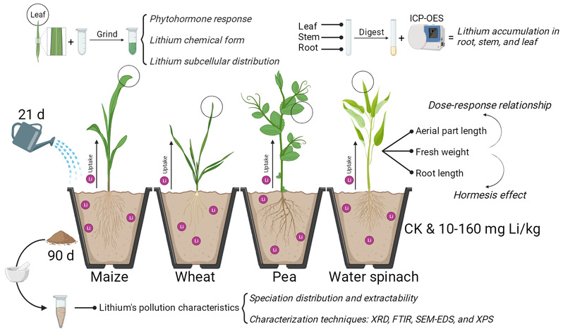 2024年8月20日,成人导航 王祥荣教授城市生态学研究团队在国际著名学术刊物Environmental Science & Technology上在线发表了题为“Integrated Analysis of Pollution Characteristic and Ecotoxicological Effect Reveals the Fate of Lithium in Soil-Plant Systems: A Challenge to Global Sustainability”的研究论文。锂具有优异的电化学性能,在锂电池生产中起着举足轻重的作用。然而,在人为因素的作用下,锂成为了环境介质中的新污染物。该研究利用多物种、多参数和多技术方法,以玉米、小麦、豌豆和蕹菜作为模式物种,模拟并构建土壤-植物系统,对锂的污染特征和生态毒理学效应进行了系统的评估。研究结果揭示,锂以无定形状态持续存在于土壤表面,能够改变表面功能基团和化学键,同时锂具有较高的迁移性,弱酸提取态锂占外源锂的29.66%~97.02%,但少量的外源锂倾向于形成残渣态组分。植物分析表明,经过21天的培养后,10~80mg/kg的锂能够显著促进玉米和豌豆的生长,但抑制四种植物地上部长度的LC50为173.58~315.63 mg Li/kg,整体表现出“低促高抑”的毒物兴奋作用。锂在四种植物叶片中的富集量至高达1127.61~4719.22 mg/kg,其无机态组分占18.60%~94.59%,细胞质组分占38.24%~89.70%。随着处理水平的增加九种植物激素含量呈现先上升后下降的动态趋势,PLS-SEM模型分析继而表明锂对植物的生长刺激作用可能与其对植物激素水平的影响有关。进一步又发现,蕹菜表现出较优异的锂富集能力和胁迫耐受性,有希望在未来成为潜在的修复物种。该研究有助于更全面地理解锂在土壤-植物系统中的环境行为,数据和结果将有利于理解、发现和应对全球可持续发展下锂带来的新挑战。