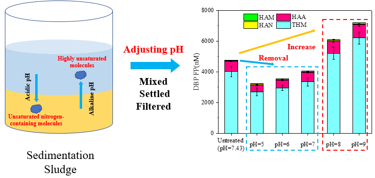 课题组针对水厂生产废水处理和回收利用现状,对上海市占总供水量92%的水厂进行全覆盖研究分析,提出方案解决现行污泥浓缩和废水回收利用等问题,按照“一厂一策”的原则提出《上海市水厂生产废水回用方案》,研究成果在包括月浦、泰和、闸北、杨树浦、南市、长桥、徐泾、闵行、罗泾、金山海川等11家水厂开展应用。课题组研究提出了生产废水的风险识别方法,利用傅里叶变换离子回旋共振质谱(FT-ICR-MS)对典型存在的风险有机物进行识别,证实生产废水中低、中、高分子量有机物的组成规律。研究发现卤乙腈(HAN)和卤代乙酰胺(HAM)生成潜能与高度不饱和含氮化合物高度相关,此类化合物在弱酸性条件下被高效去除,解释了生产废水中DBP前体物的去除机理,研究成果分别发表在Water Research,2021,194(116964)和Water Research,2020,186(116346)。在此基础上,研究提出生产废水pH科学调控方案,经调控后,形成的污泥絮体显著增加了对低分子量有机物的吸附去除,进而调控DBP前体物的去除,三卤甲烷(THM)、卤乙酸(HAA)、卤乙腈(HAN)和卤代乙酰胺(HAM)生成潜能降低9–26%,全面实现生产废水回用过程中DBP生成风险管控,该研究成果发表在Resources, Conservation & Recycling, 2022, 179(106135)上。针对水厂超滤膜生产废水的资源化回用,课题组开展了从中试到生产性试验的研究,开展了为期4个多月的超滤膜处理中试规模(10 m3/h)适应性研究,考察超滤技术对上海市罗泾水厂滤后水的处理效果、回用水质安全性、工艺运行的稳定性及系统运行能耗、药耗,为罗泾水厂超滤膜深度处理工程提供第一手技术资料和设计依据。罗泾水厂新建膜处理工程造价3亿,项目由成人导航 、上海市政设计研究总院和上海城投水务有限公司承担。