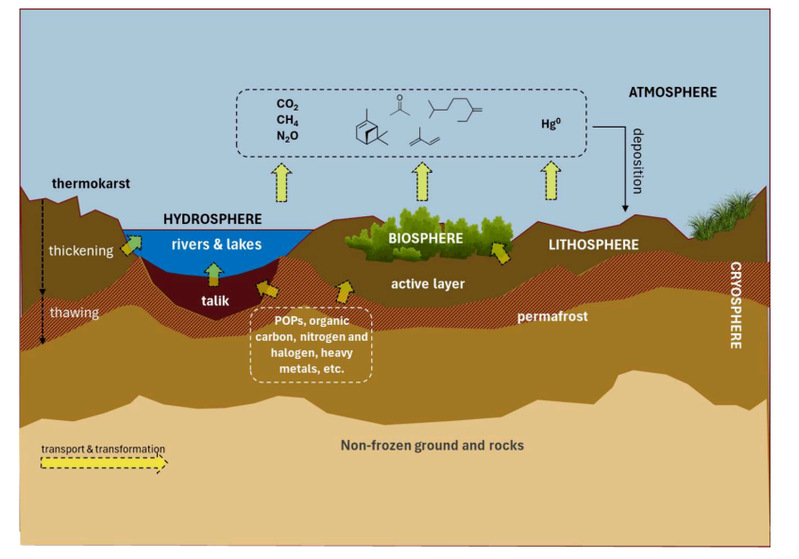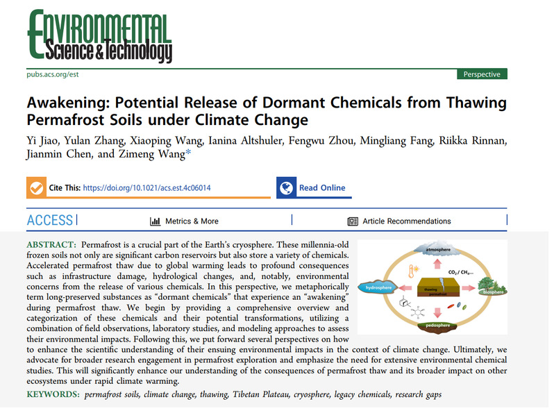 近日,在国家自然科学基金面上项目、第二次青藏高原综合科学考察研究项目(STEP)等资助下,成人导航 环境系王梓萌教授联合丹麦哥本哈根大学、瑞士洛桑联邦理工学院,和中国科学院西北生态环境资源研究院、青藏高原研究所等单位的多位长期从事冰冻圈生态环境研究的学者,以《Awakening: Potential Release of Dormant Chemicals from Thawing Permafrost Soils under Climate Change》为题,在Environmental Science & Technology上发表了展望(perspective)论文。