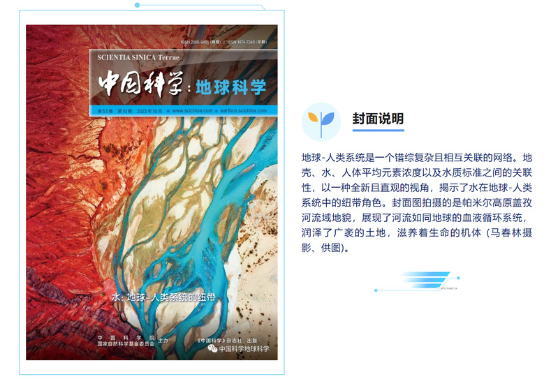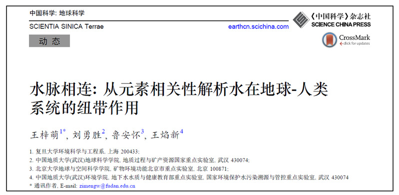 在国家自然科学基金和中国科学院地学部学科发展战略研究项目的资助下,成人导航 王梓萌教授与项目负责人,中国地质大学(武汉)校长王焰新院士、北京大学鲁安怀教授、长江大学校长刘勇胜教授联名在《中国科学·地球科学》杂志上撰文,展示项目研究成果。文章以“水脉相连”为主题,以直观的“元素相关性”分析为切入点,从新颖的角度解析了水圈和水循环在地球-人类系统的纽带作用。论文以中英双语发表,并被选为2023年10月期的封面。