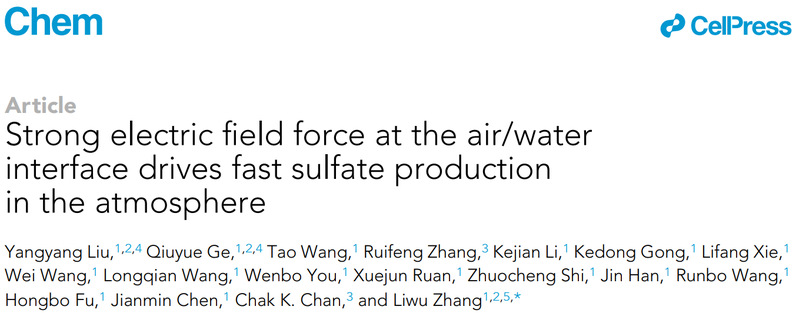 近日,成人导航 张立武团队在大气化学领域取得重要研究进展。利用共聚焦表面增强显微拉曼光谱为研究手段,在大气气溶胶气-液界面效应加快二次硫酸盐形成机制的研究中取得重大突破。通过实验室模拟,数值计算以及理论计算揭示了气溶胶气-液界面强电场是加速大气二氧化硫氧化的重要驱动力,推进了气-液界面促进大气化学过程的更深层次理解。研究成果以“Strong electric field force at the air/water interface drives fast sulfate production in the atmosphere”为题,于近日发表于Cell姊妹刊《化学》(Chem)期刊上。