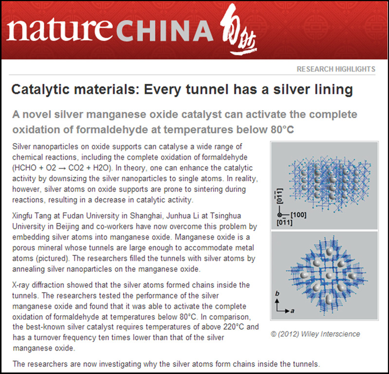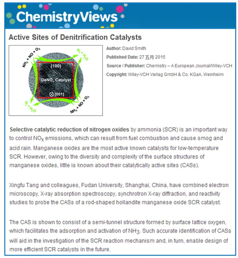 确定了一种高活性的二氧化锰催化剂在SCR反应中的催化活性位(Catalytically Active Sites),对SCR反应的机理研究和高效SCR催化剂的设计开发具有重要的意义;相关成果相继被国际著名的ChemistryViews网站以Highlights的形式报道,同时被Angew. Chem. Int. Ed杂志以Spotlights的形式报道(Angew. Chem. Int. Ed. 2015, 54, 7740-7743)。