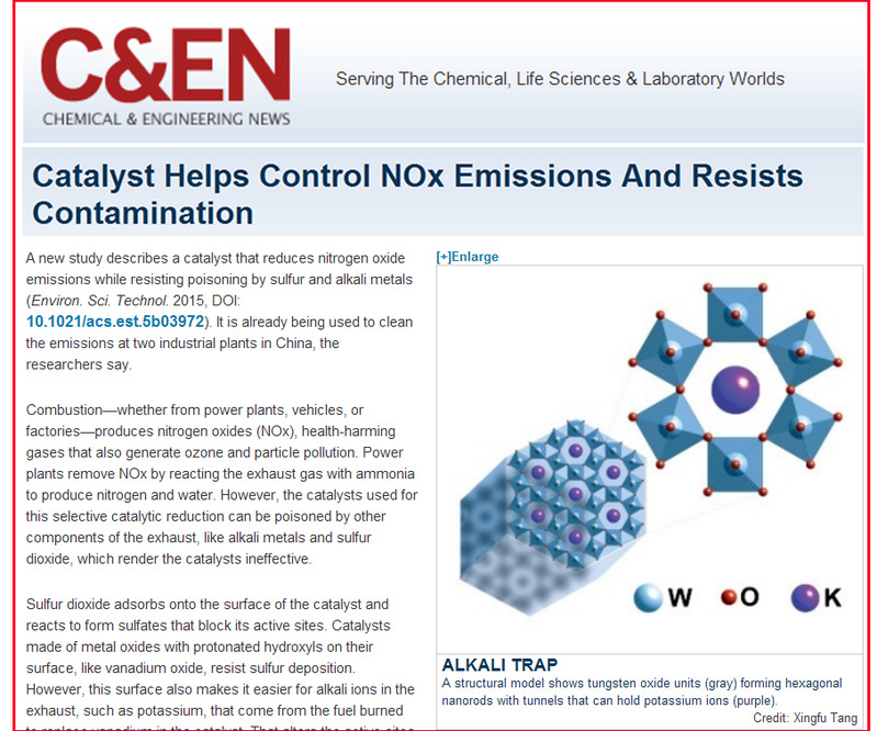 构建了碱金属离子交换-配位型中毒机理,发明了强抗碱金属中毒的高效脱硝催化剂,突破了传统脱硝催化剂应用于高碱或碱土金属燃煤或生物质燃料烟气脱硝技术的一个重要瓶颈;相关成果被美国化工新闻杂志Chemical & Engineering News专题报道,同时被美国环保汽车会网Green Car Congress报道。