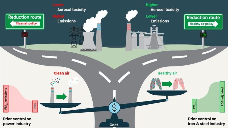 针对这一难题,成人导航 环境健康团队与清华大学环境学院教授王书肖等多个团队合作,对我国重点工业源(包括钢铁、电力和水泥行业)产生的气溶胶开展系统研究。通过环境化学、毒理学、大气科学、经济学等多学科方法交叉融合,发现了工业源气溶胶的生物毒性差异,阐明气溶胶中金属等关键毒性化学组分的内在关联机制(图1)。基于气溶胶毒性效应的量化参数,结合我国大气污染物排放清单、空气质量模式、人群暴露模型与费效分析,阐释以削减“健康风险”为导向的大气污染调制机制(钢铁行业实施超低排放改造),相比于以削减气溶胶“质量浓度”为导向的机制(电力行业实施超低排放改造),可以更为有效降低人群健康暴露风险(约5.4—8.2倍)。此外,若优先对气溶胶毒性效应更高的工业源开展超低排放(钢铁),同时可以节约大量的经济成本(图2)。