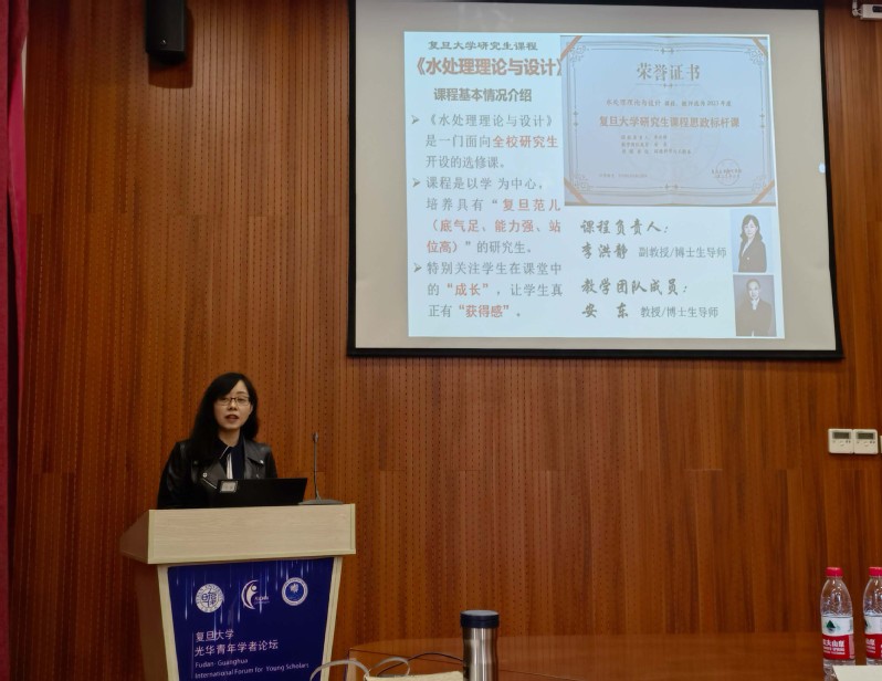 李洪静介绍了“水处理理论与设计”研究生课的建设。该课程以“学”为中心,培养具有“复旦范儿(底气足、能力强、站位高)”的研究生。任课教师采用“启发互动式”教学方法,用环保领域榜样的例子鼓舞学生,还采用“体验式场景”教学模式,受到研究生的欢迎。课程教学案例“绘制新时代中国的水处理设计蓝图”入选《成人导航 课程思政优秀教学案例100》。课程获批成人导航 2022年研究生课程思政项目,并在2023年入选成人导航 首批研究生课程思政标杆课程。