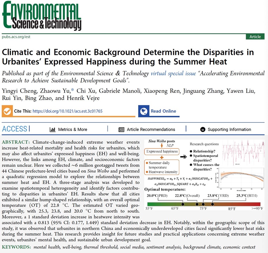 本研究以“Climatic and economic background determine the disparities in urbanites’ expressed happiness during the summer heat”近期发表于ES&T。本研究第一单位为成人导航 ,合作单位还包括丹麦哥本哈根大学、瑞士洛桑联邦理工学院、南京大学、中国科学院心理所、南京林业大学等。本研究得到国家自然科学基金面上项目、上海市浦江学者项目、上海市自然科学基金面上项目、中国生态学学会生态学青年托举人才等项目资助。