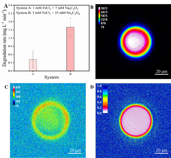 对于小粒径液滴,在O2供给充分的条件下,光化学反应速率仍随液滴粒径减小而升高,这表明可能存在其他原因贡献于光化学反应加速。数值模拟表明液滴内部光照强度高于边缘区域,并且液滴部分区域光强高于入射光(图1)。同时,小粒径液滴内部O2供给充分,在光照强度增加的情况下,将使得小液滴的光化学反应活性高于大液滴。另外,利用受激拉曼光谱证明了微液滴气液界面处Fe(III)-oxalate络合物的富集(图2)。在小粒径液滴中,气液界面富集将更加显著,加速小液滴的光化学反应。