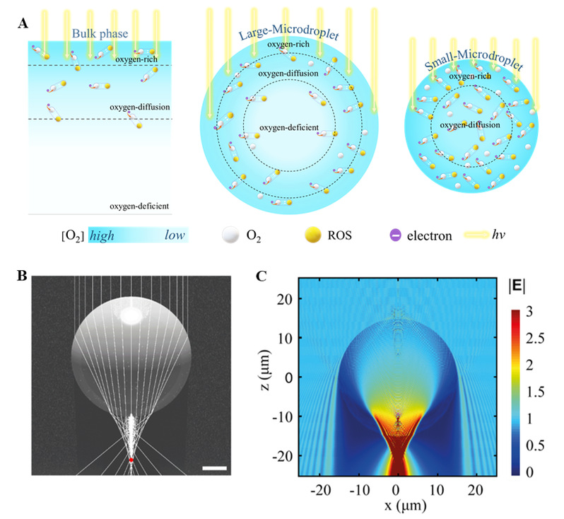 微液滴研究近期引起广泛关注,一方面大气云滴和海洋飞沫气溶胶等微米级液滴无处不在,另外一方面以微液滴为反应器也在化学合成及生物研究方面得到重视。研究表明微米级液滴可显著加速化学反应,并且可使部分反应自发进行,潜在原因主要是微液滴其特有的理化性质,比如pH改变、气液界面部分溶剂化和气液界面丰富等。然而,目前微液滴中的光化学反应与体相是否不同及其反应机制还不清楚。