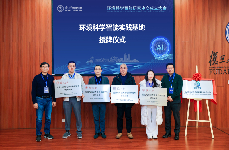 姜育刚副校长、俞汉青院士、施敏处长、王琳主任共同为环境科学智能研究中心揭牌。四家人工智能领域科技企业和复旦环境系共建环境科学智能实践基地,启动产学研深度融合,陈建民教授、张立武副主任为四家企业授牌。