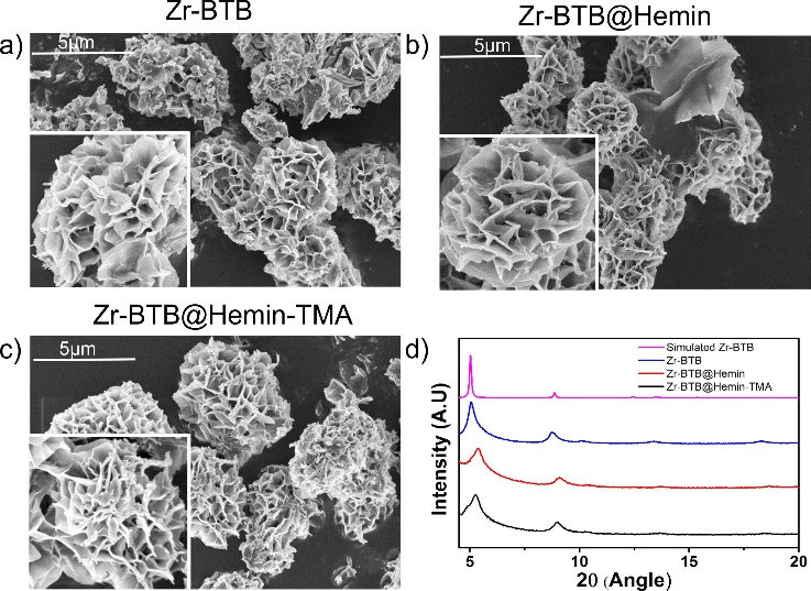 图1.Zr-BTB、Zr-BTB@Hemin和Zr-BTB@Hemin-TMA的SEM图像
