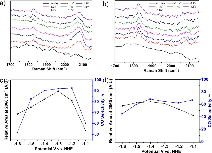 图2.原位拉曼光谱研究CO2电催化还原机制
