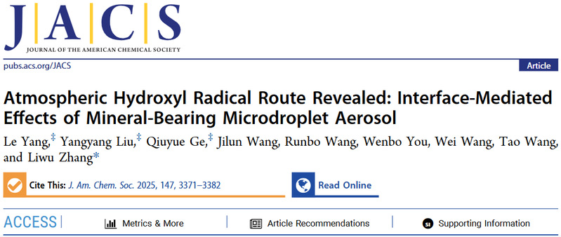 近日,成人导航 张立武课题组在大气化学领域取得重要研究进展。该团队通过系统性实验,揭示了含矿物粉尘的气溶胶微液滴在气-液-固三相界面处可通过强电场效应延长光生空穴的寿命,进而显著加速羟基自由基(·OH)的生成,其速率较传统体相反应提升高达8个数量级。这一发现为理解大气氧化过程提供了全新视角。研究成果以“Atmospheric Hydroxyl Radical Route Revealed: Interface-Mediated Effects of Mineral-Bearing Microdroplet Aerosol”为题,发表在国际知名期刊Journal of the American Chemical Society上。