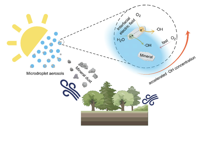 羟基自由基是大气中最重要的氧化剂之一,主导气溶胶成分转化、污染物降解及气候调节。先前的研究表明气溶胶微滴可以自发产·OH。此外,矿物粉尘,尤其是含有特定矿物(如钛、铁)的粉尘,能够通过光化学途径促进·OH的生成。然而,以往的这些研究以纯粹的固体或者液滴作为理想的气溶胶形态来研究大气化学过程,忽略了固体-液滴这一混合媒介状态在实际大气的可能扮演的重要作用,其涉及的反应机制或许超越了当前对气-固或气-液界面介导的快速界面反应的认知。