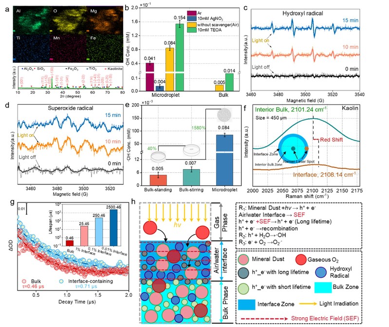 图2. (a) 高岭土的 SEM-EDX和 XRD 图。 (b) 不同反应条件下,含高岭土的气溶胶微滴和体相中·OH的生成。(c) ·OH和 (d) ·O2-的ESR图谱。(e)在有无搅拌的条件下,含高岭土的体相溶液以及相应的微滴气溶胶体系中·OH的生成。(f)在含高岭土的NH4(SO4)2微液滴的气-液界面和内部测量的拉曼位移(C≡N),D =~450 μm。 (g) 含界面区域和体相溶液中光生空穴的寿命。(h)含矿微滴气溶胶加速 ·OH 光化学生成的机制示意图。
