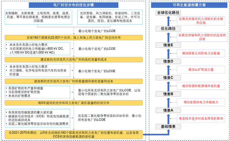 首先,研究开发了全球太阳能和风能的电力系统优化模型,综合考虑了全球多年太阳辐射和风向风速的小时级数据、气象和地貌等多种空间信息,构建了时空高分辨的地理信息数据智能系统,并考虑了技术改进、电网升级、统筹能源储存和电力传输等基础配套设施建设,以及区域电力传输、全球矿产贸易、优化光伏电池板和风力涡轮机全球供应链等方案对风光发电潜力的作用(图 1)。